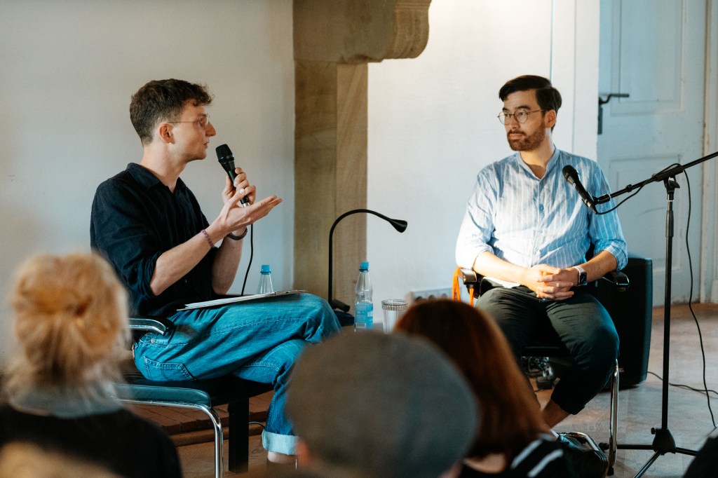 Scheinbar ganz plötzlich verkünden dann auch die Zeiger: Es ist 19 Uhr, die Lesung im Renaissancesaal des Ledenhofs beginnt. Im Rahmen der Tagung liest Yannic Han Biao Federer aus seinem autobiographisch geprägten Buch Für immer seh ich dich wieder. Vincent moderiert die Veranstaltung, die öffentlich ist und zu der mehr Menschen kommen, als wir erwartet haben. Das Thema ist kein leichtes; der Text erzählt vom plötzlichen Tod eines ungeborenen Kindes. Was das Buch beim Lesen schafft, prägt auch die Atmosphäre im Saal: Yannic liest, und da ist viel Schmerz, viel Liebe und leiser Humor, der die nachdenkliche Stille im Publikum durch vereinzeltes Lachen unterbricht. Man möchte zum Schluss trotzig fragen, warum das Leben manchmal so unfair ist und wie die Welt mit so viel Trauer weiter funktionieren soll. Man begreift aber auch die Wärme, die in Trost und Freundschaft liegt. Und versteht, wie wichtig es ist, über Tod und Verlust zu sprechen.